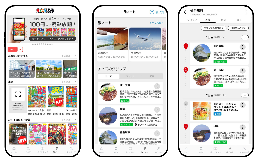 まっぷるリンクで提供中のサブスクリプションサービス「ガイドブック読み放題」と併用すれば、旅のプランニングはさらに充実します。旅のスタイルに合わせて選べるプランで、全国のガイドブックを電子書籍でパラパラと読みながら、気になったスポットを次々と「旅ノート」にクリップしていく──。ガイドブックの網羅性と、デジタルツールの利便性を組み合わせることで、より深く、より効率的な旅の計画づくりが可能になります。