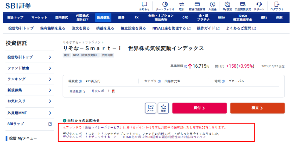 デジタルレポート対象ファンド※の銘柄詳細画面、「当社からのお知らせ」より閲覧ください。
