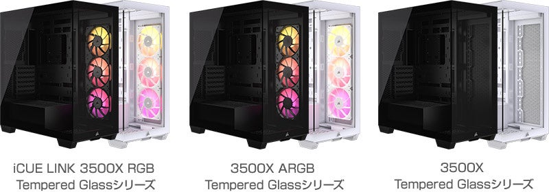 「iCUE LINK 3500X RGB Tempered Glass」シリーズにはiCUE LINK対応ファン、「3500X ARGB Tempered Glass」シリーズにはマザーボードでコントロール可能なアドレサブルRGBファンを標準搭載しており、豊かなドレスアップを楽しめます。