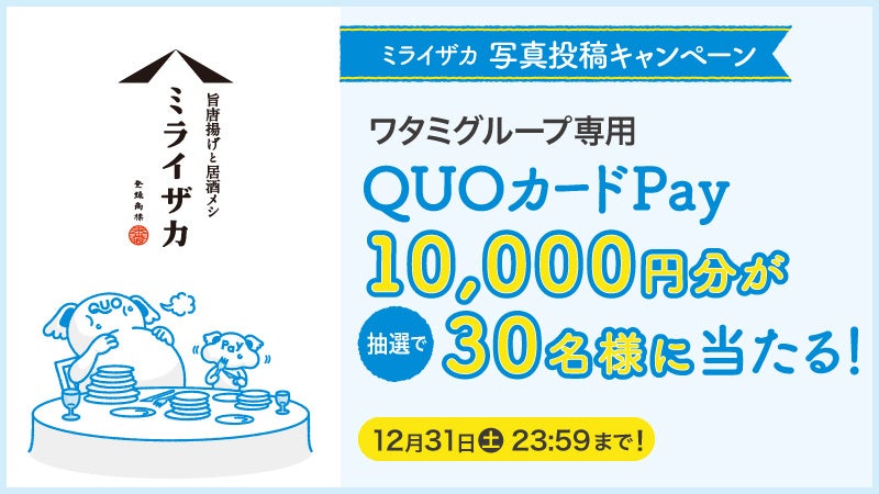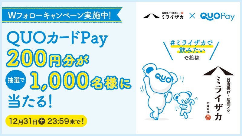 【賞品について】ミライザカ専用QUOカードPay 10,000円分 30名様※全国のミライザカのみでご利用いただけます。ご注意ください。※ミライザカ専用QUOカードPay の有効期限は2023年12月31日までです。