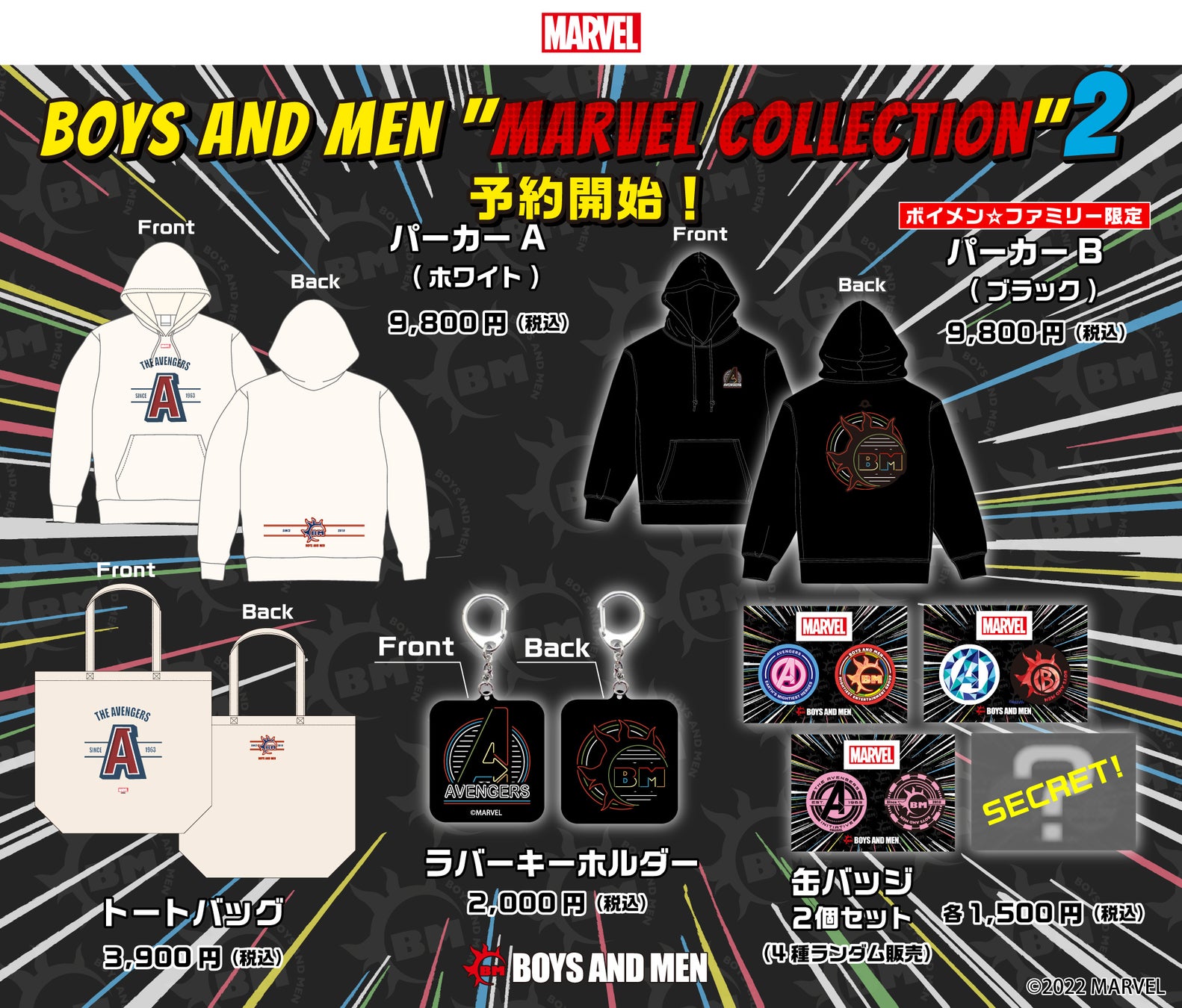株式会社SKIYAKI(本社:東京都渋谷区、代表取締役:小久保知洋、以下「SKIYAKI」)は、2022年2月14日(月)18:00より、全世界で多くのファンから愛されるMARVEL作品をモチーフにした期間限定アーティストオリジナルグッズ“MARVEL COLLECTION”の第二弾の予約販売を開始いたします。今回発売するのは、MARVEL「Avengers」ロゴをあしらったBOYS AND MENの公式グッズで、パーカー2種、トートバッグ、キーホルダー、缶バッジ2個セットの全5商品。これらの商品は全て、2022年2月14日(月)18:00〜2月27日(日)23:59に期間限定で、BOYS AND MEN 公式グッズ販売ページにて予約販売いたします。また2種類のパーカーのうち1種類(パーカー ブラック)は、BOYS AND MEN 公式ファンクラブ「ボイメン☆ファミリー」有料会員限定での予約販売となります。