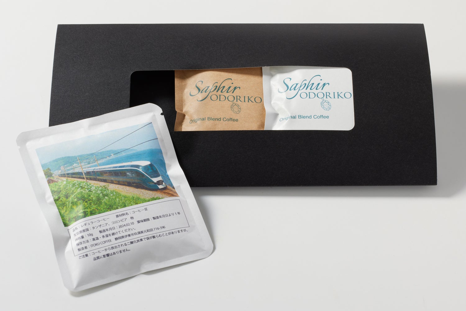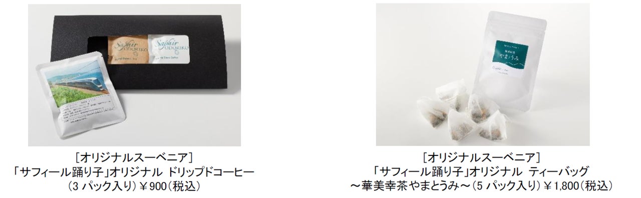 新たに、お土産としてお持ち帰り可能な「オリジナルスーベニア」の販売を開始します。車内でも好評いただいているオリジナルの「ドリップコーヒー」と五十嵐美幸シェフ監修の「ティーバッグ~華美幸茶やまとうみ~」をご用意します。当日の車内販売にてご用意しておりますのでアテンダントへお気軽にお声掛けください。