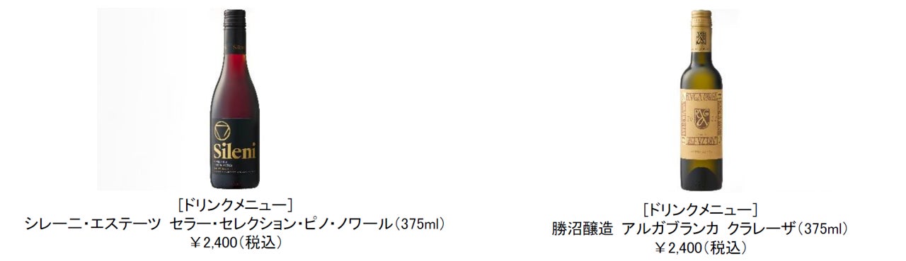五十嵐美幸シェフがカフェテリアで提供するメニューと相性の良いワインをセレクトしました。軽やかな果実の香りと穏やかなタンニンのフレッシュかつ繊細な味わいが特徴の赤ワイン、シュールリー製法で醸した高い芳香性と酸でふくよかな味わいが特徴の白ワインの両方をご用意します。