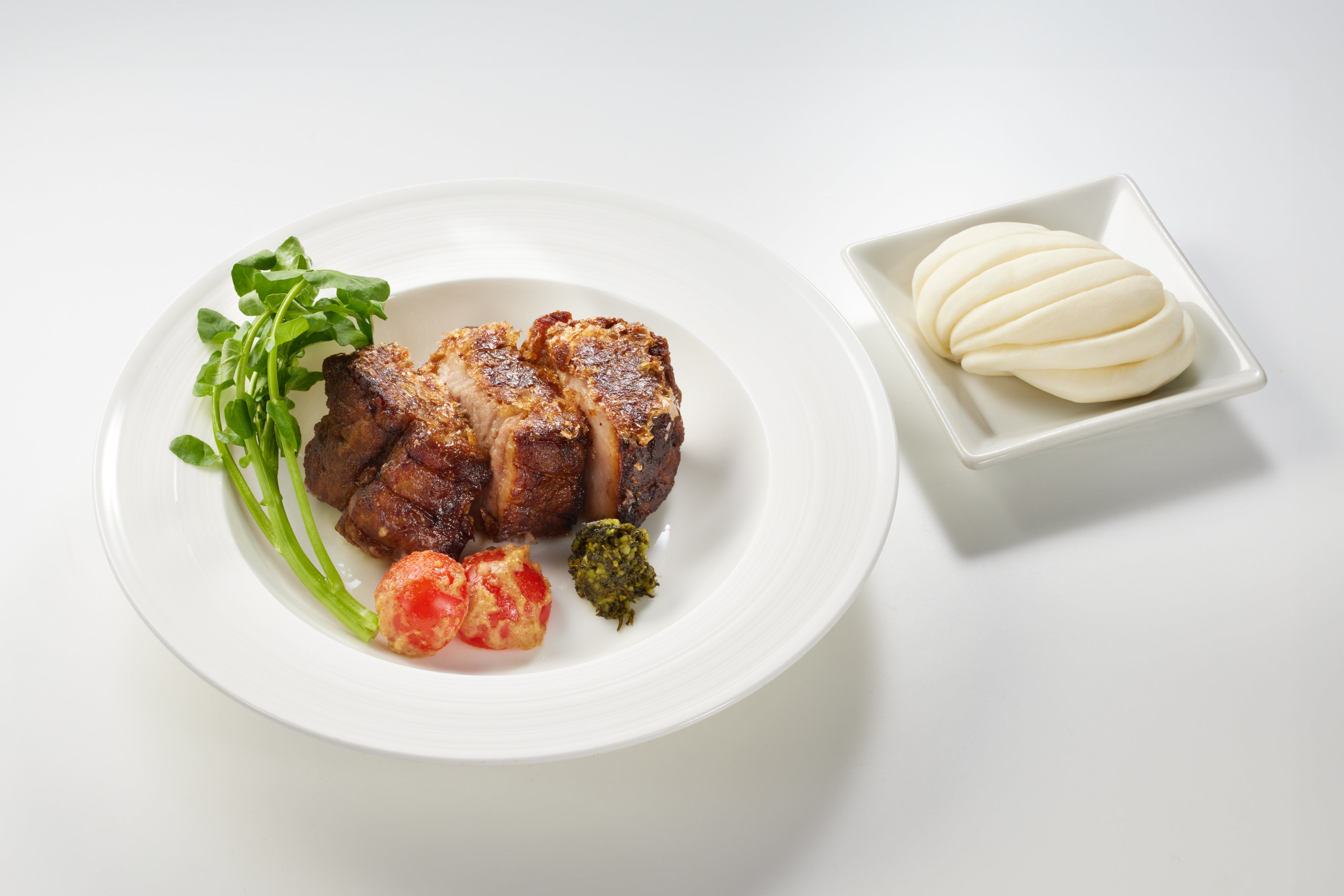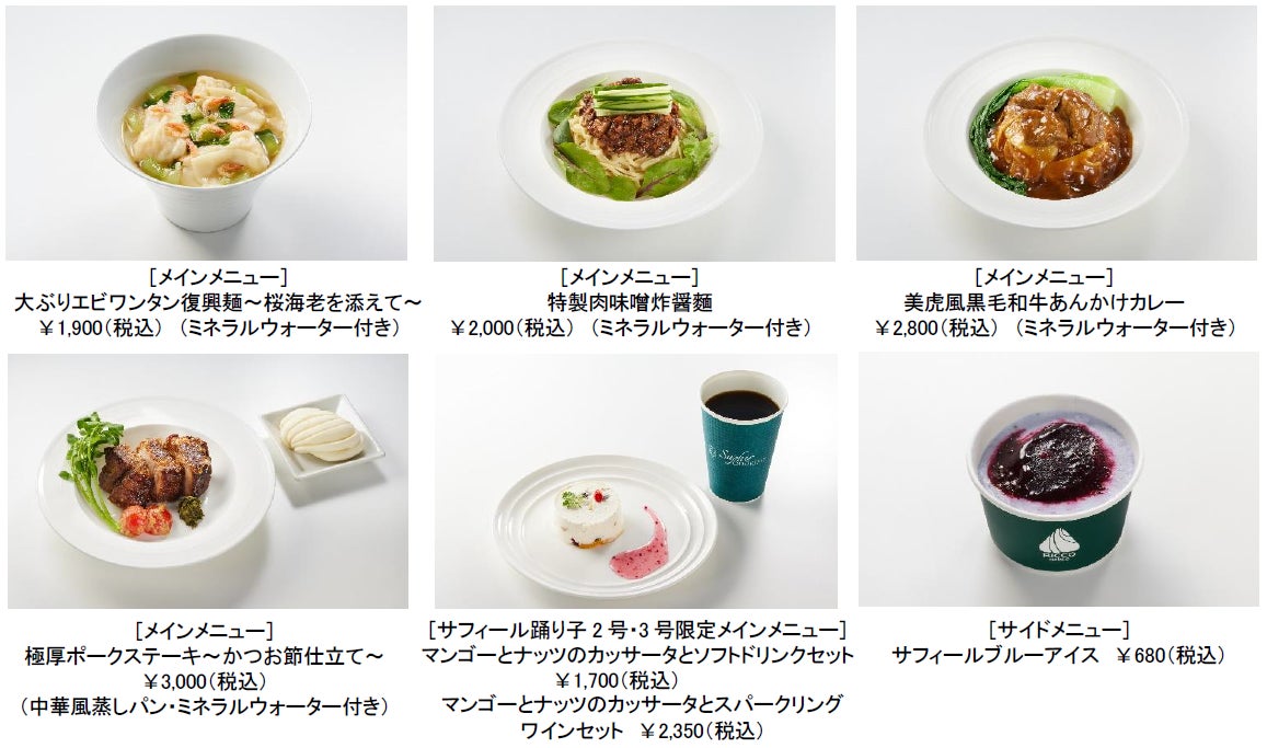 定番の「大ぶりエビワンタン復興麺」に桜海老を添えたアレンジメニューに加え、豚の角煮をほろほろにほぐし、キノコ・甜面醤(てんめんじゃん)・オイスターソースなどを合わせた特製肉味噌あんと平打ちの復興麺を和えて食べるオリジナルの炸醤麵、栃木県産黒毛和牛のもも肉とタケノコをあんかけ仕立てにしたカレーライス、丁寧に火入れをした厚みのある豚肩ロースにかつお節を衣のようにまぶしたちょっと贅沢なステーキを新メニューとしてご用意します。「サフィール踊り子2号・3号」限定で提供する濃厚な甘みと爽やかな酸味のハーモニーが特徴の「マンゴーとナッツのカッサータ」とドリンクのセットもおすすめです。