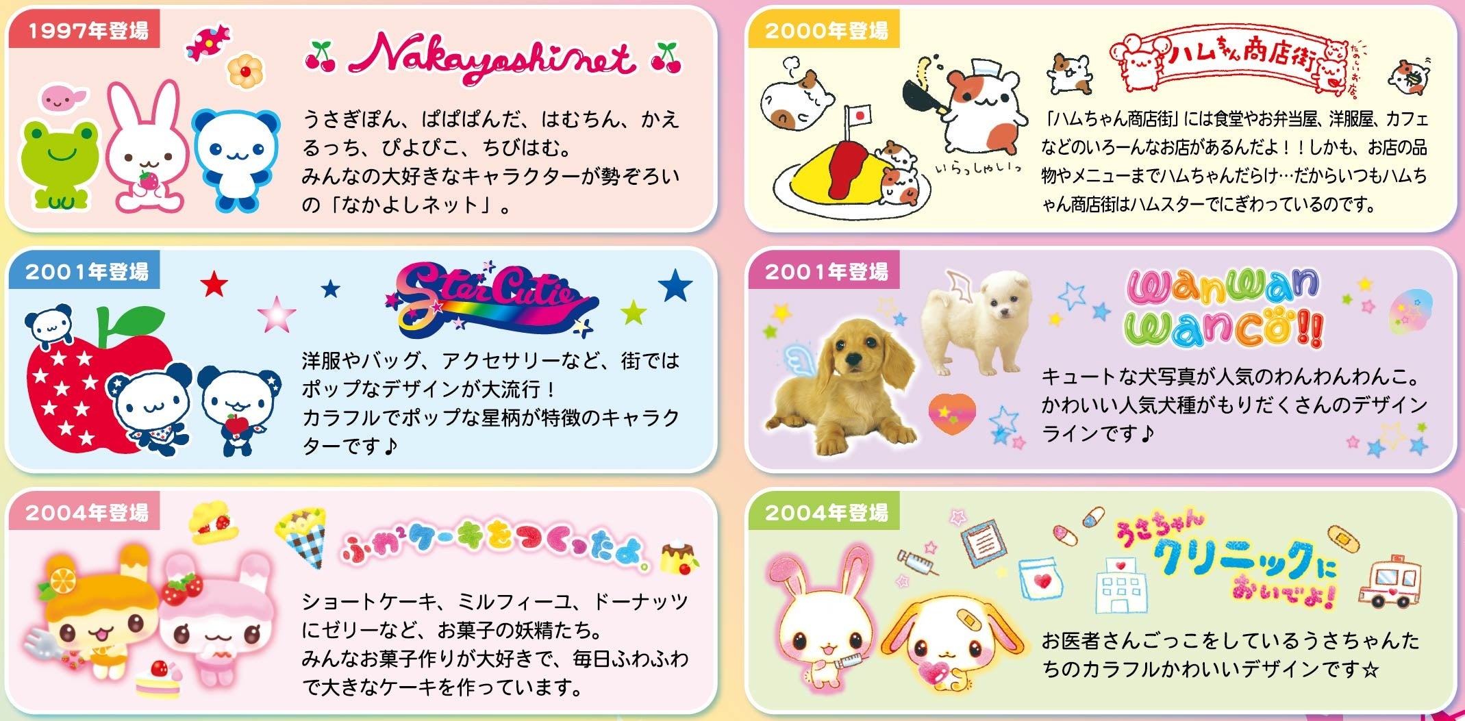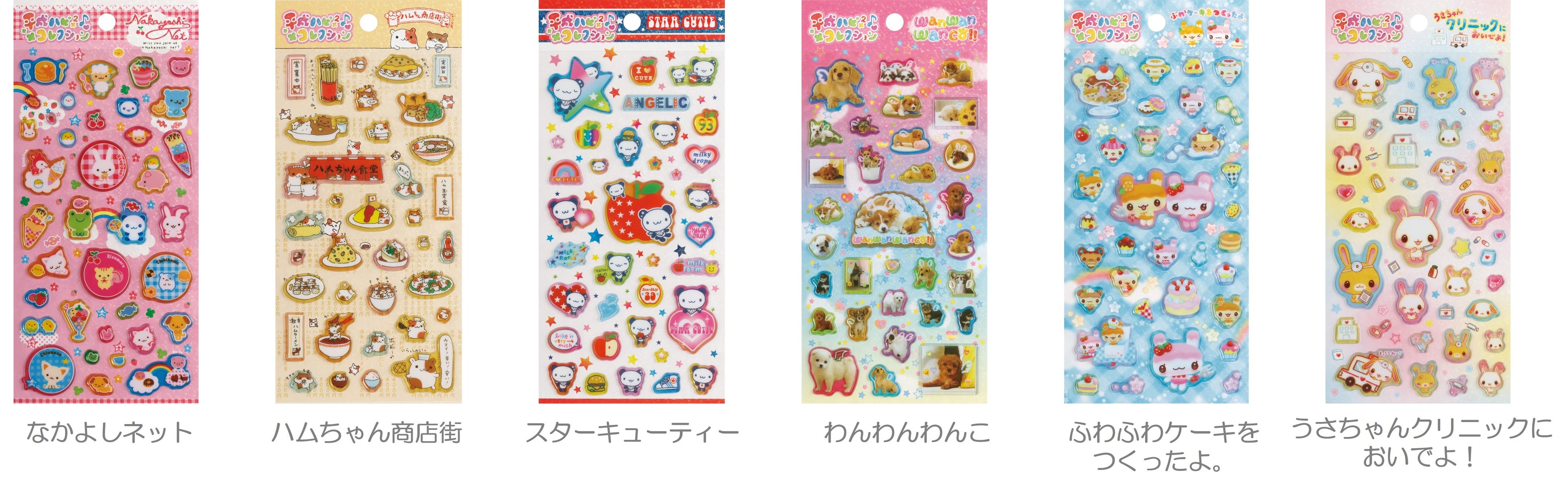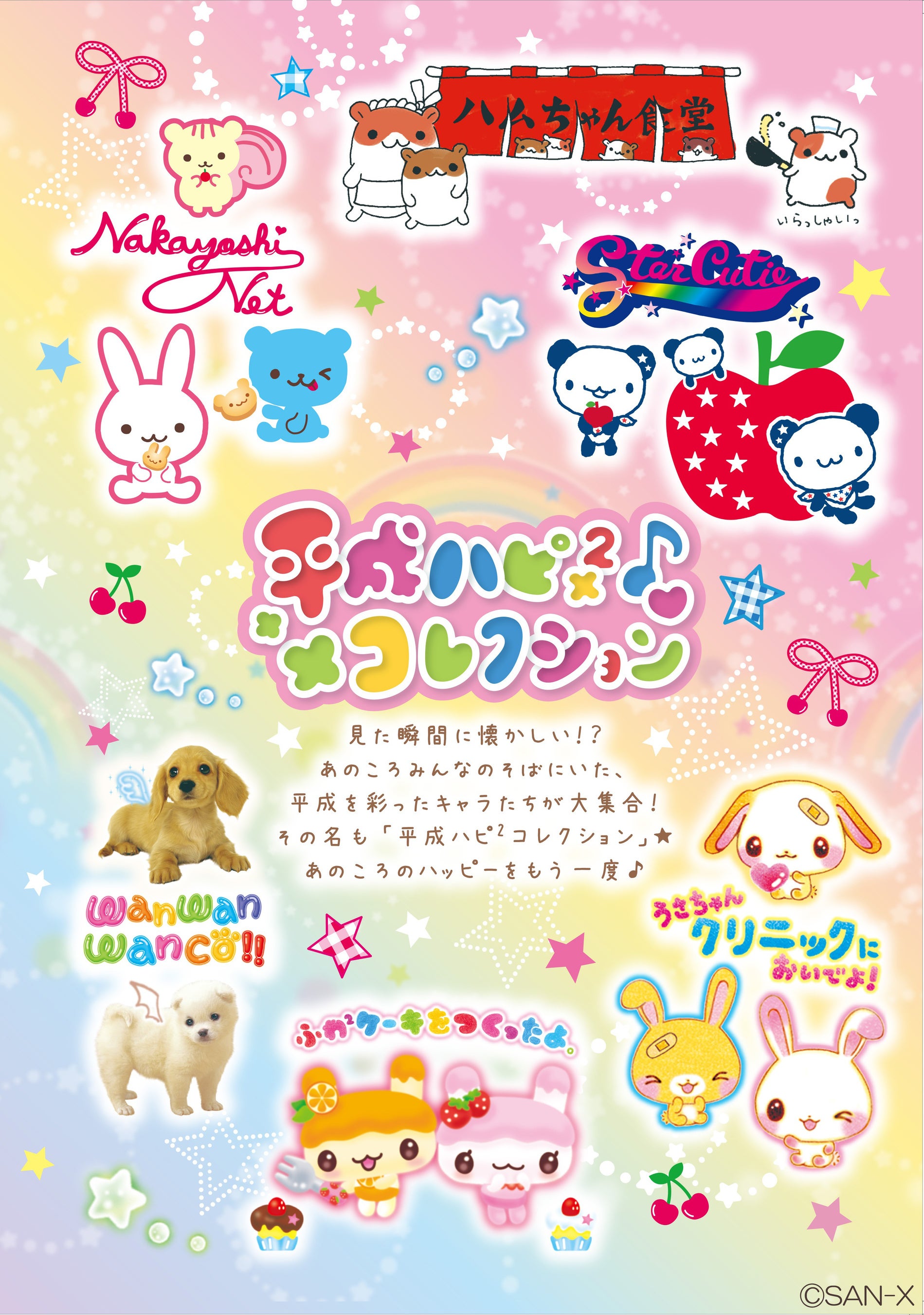 「なかよしネット」「ハムちゃん商店街」「スターキューティー」「わんわんわんこ」「ふわふわケーキをつくったよ。」「うさちゃんクリニックにようこそ!」の6つのキャラクターが、懐かしくて新しいアイテムになり『平成ハピ²コレクション』として登場します。
