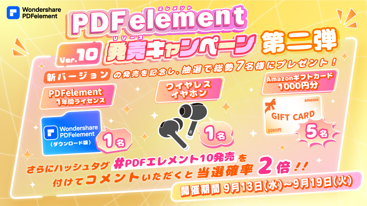 【当選確率2倍のチャンスも!Amazonギフトカードなどが当たる!】PDF編集ソフト『PDFエレメント』バージョン10リリース記念キャンペーン第二弾開始!|Wondershare PDFelement