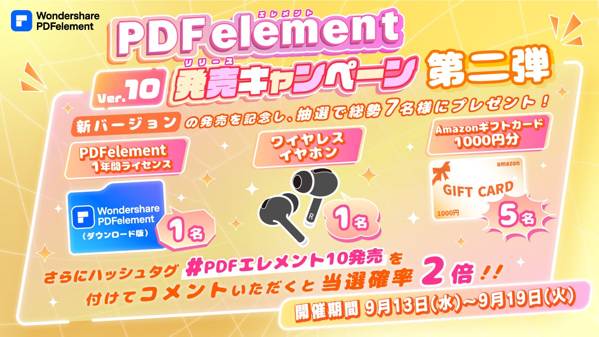 公式X(旧Twitter)にて『PDFエレメント』バージョン10、リリース記念キャンペーン第二弾を開催中!応募はこちらから→ https://x.com/pdfelement_jp/status/1701747520144060772?s=20
