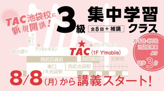 通常、TACがご用意している3級対策講座は1ヵ月で進めるのに対して、当クラスでは2週間の短期集中で学習していきます。毎回の講義後には質問対応の時間を設けているため、分からないことがそのままになることもなく、安心して学習継続ができるコースです。頻出論点を中心にしっかり学習ができ、アウトプットトレーニングができる「直前対策」をその後、別途受講いただいても、9月にはネット試験で合格を狙うことができます。短期間で一気に3級を修得したいことはもちろん、受講期間が夏休み期間中にあたり、学生の方にもオススメのコースです。