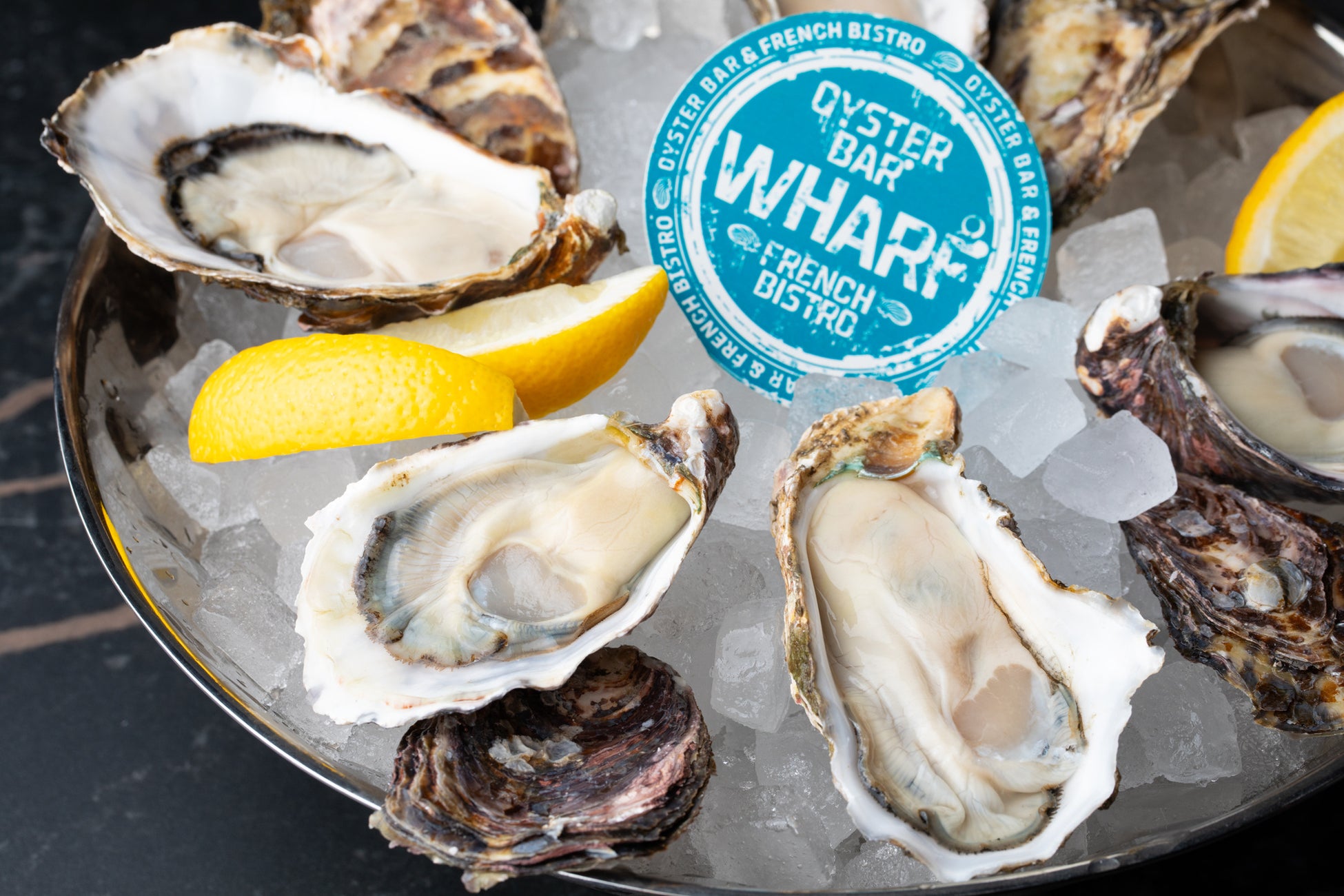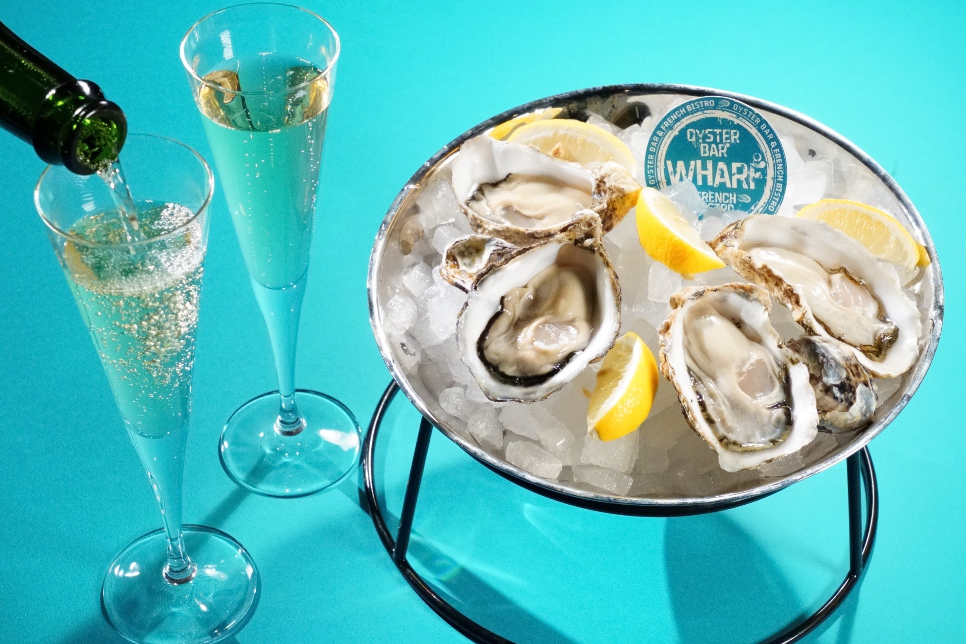 オイスターバー&ビストロWHARF(有楽町ワーフ)では、選べるペアリングドリンクと本日の生牡蠣2種食べ比べの【牡蠣ペアリングセット】が昼夜、平日土日祝問わずご用意。