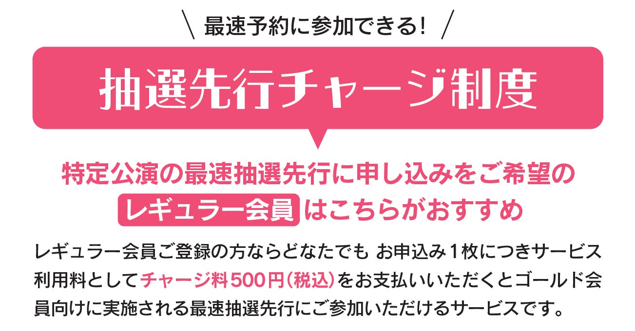 レギュラー会員ご登録の方ならどなたでも お申込み1枚につきサービス利用料としてチャージ料500円(税込)をお支払いいただくとゴールド会員向けに実施される最速抽選先行にご参加いただけるサービスです。