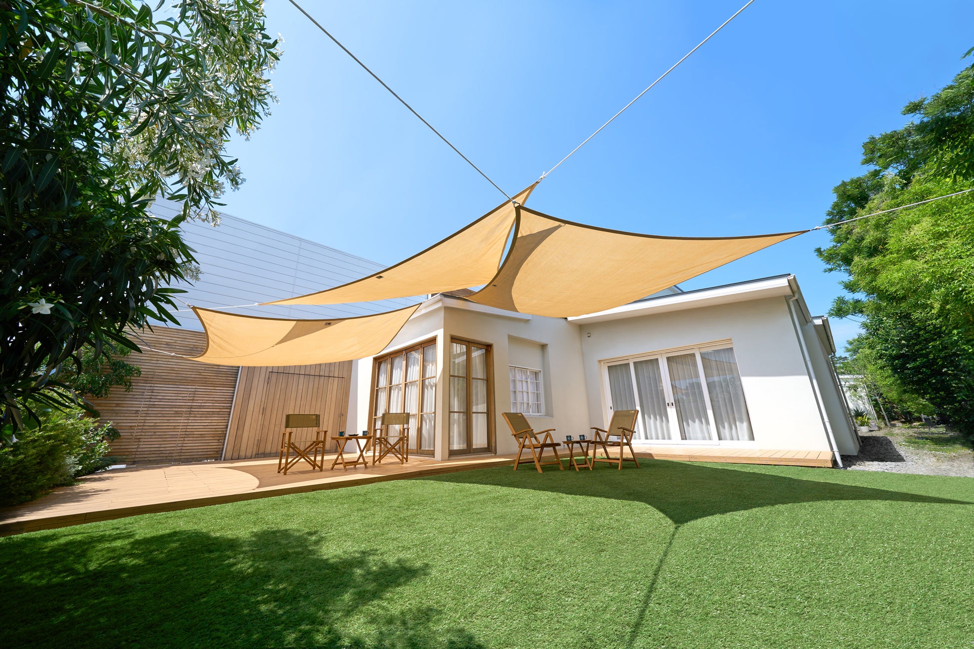 キャンプ場やBBQ場など、レジャー施設の常設用タープとしてもおすすめ。木かげにいるような快適さでアウトドアを楽しめる。