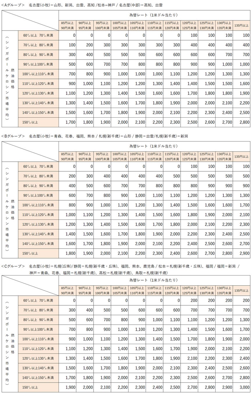 2025年7月発券分につきましては、2025年5月のシンガポールケロシン市況価格平均が1バレル当たり78.3米ドル、為替レートが1米ドル当たり144.8円であったことから、以下の金額を適用させていただきます。