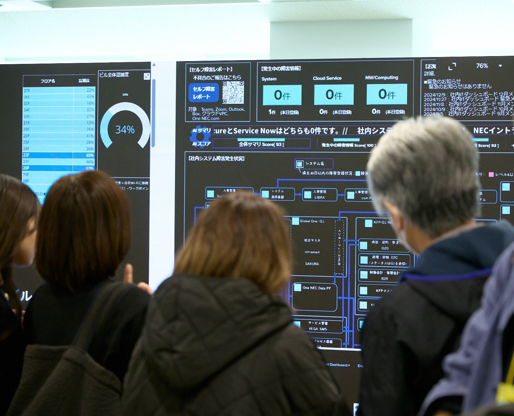 NECの経営に関する情報を「見える化」している経営コックピットを紹介。他にも社内のフロア利用率で混雑度をその場で確認できるシステムや、顔認証で開閉できるロッカーなど、社員が普段利用している最先端技術を備えたオフィスを紹介。