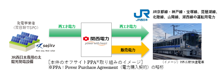 西日本旅客鉄道株式会社(以下、JR西日本)は、関西電力株式会社(以下、関西電力)および双日株式会社(以下、双日)と当社専用の太陽光発電設備を設置し、そこで発電された再生可能エネルギー由来電力(以下、再エネ電力)を、 JR西日本の代表的な列車である「新快速」等が走行する JR京都線・神戸線といった当社の近畿エリアの主要線区の列車運転用電力として、導入します。