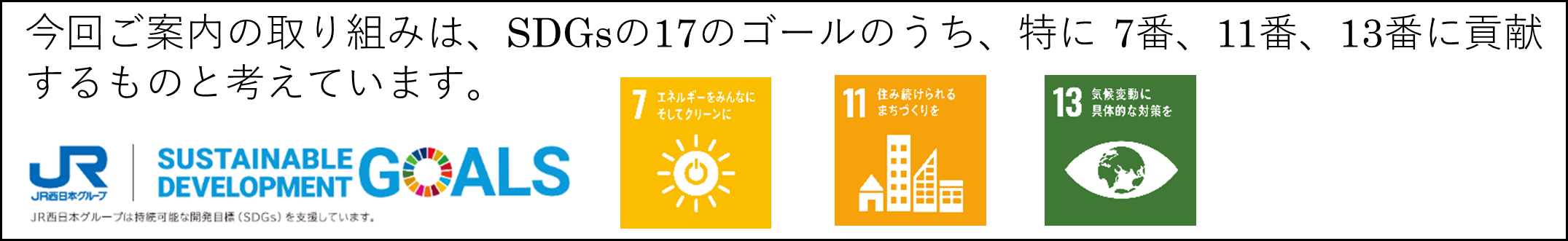 当社グループは、脱炭素社会の実現に向け、環境長期目標「JR西日本グループ ゼロカーボン2050」を掲げ、グループ全体のCO2排出量を2030年度に50%削減(2013年度比)、2050年に「実質ゼロ」とすることをめざしており、再エネ電力の導入は、その目標達成に向けた主な取り組みの一つです。私たちは脱炭素社会の実現に向け、今後もさらなる取り組みを進めてまいります。