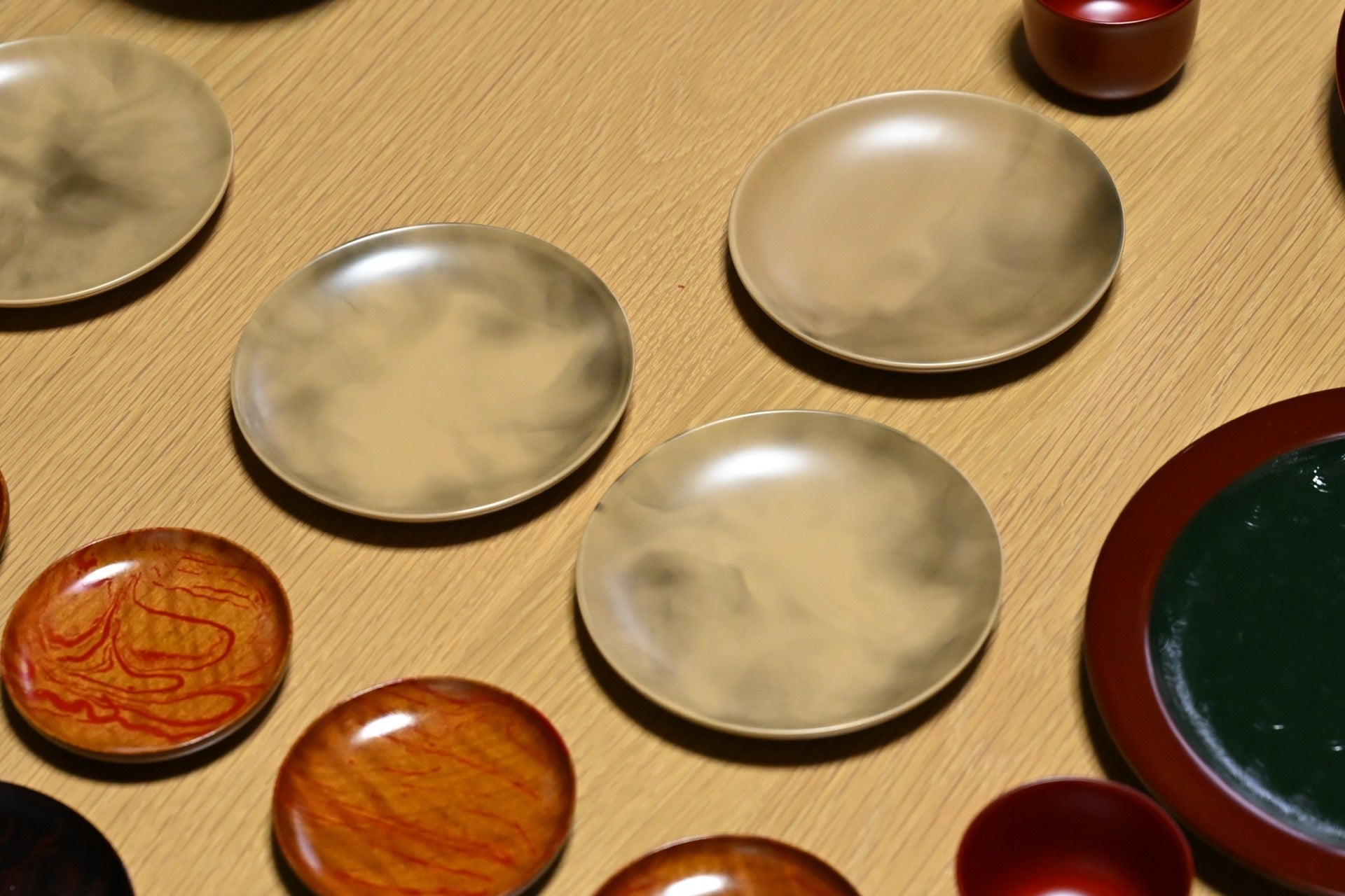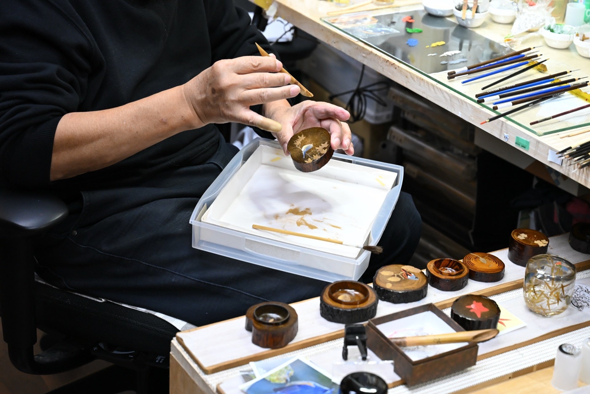 続いて訪れたのは、塗師の清水一人さんの工房。山中漆器の伝統技法「変わり塗り」の作品を拝見しながら、漆が乾く前にロウソクの火であぶり、煤で模様をつける「叢雲塗」に挑戦した。菊五郎さんの真剣な表情は、まさに「歌舞伎の見得」!? その出来栄えは!?