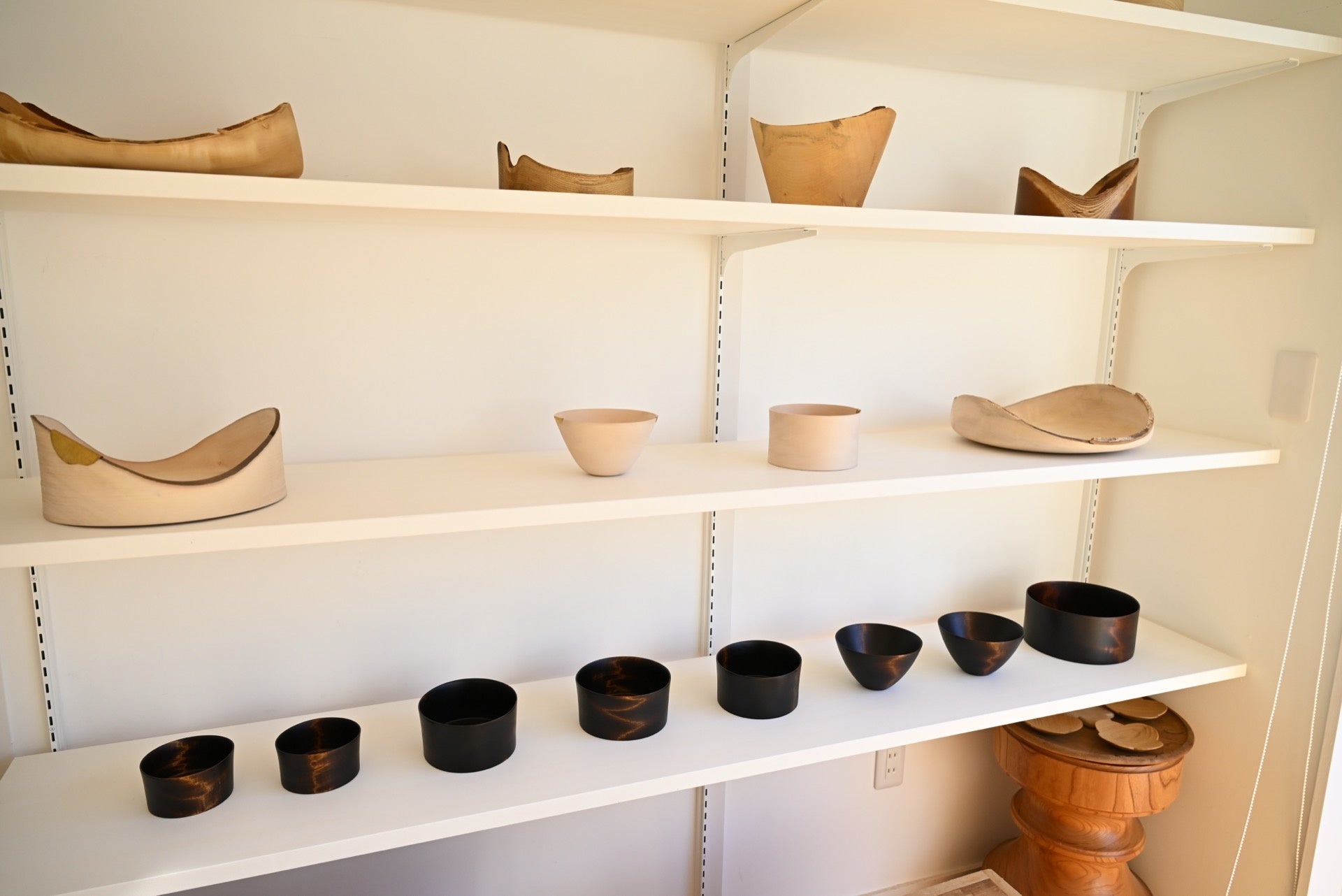 最初に訪れたのは、木地師・山田マコさんの工房。山中漆器の特徴のひとつ、輪切りにした丸太の断面から形を木取りする「縦木取り」という技法を見学した。さらにノミを振動させて模様をつける「ビリ筋」に挑戦。果たして菊五郎さんの腕前は!?