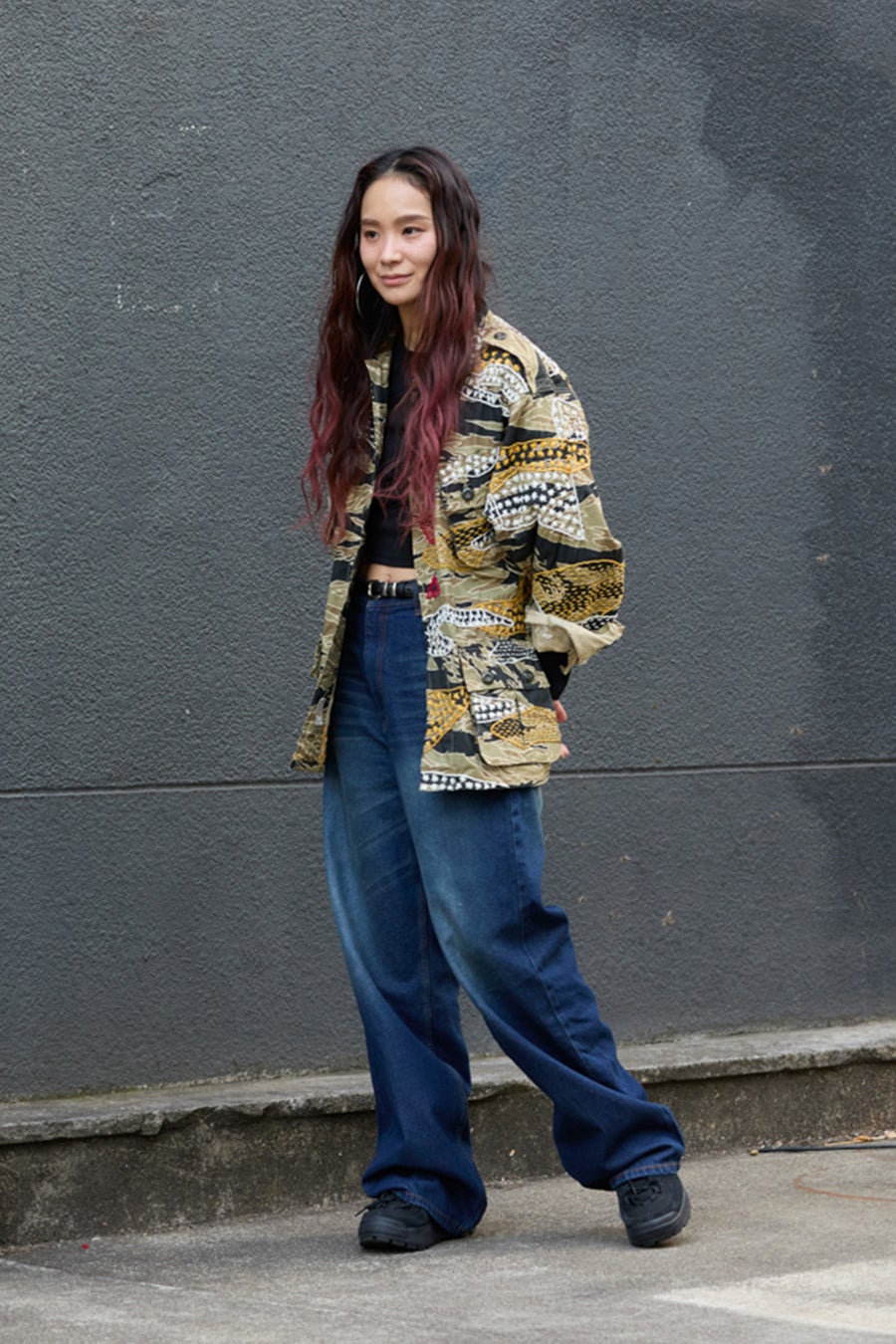 ヒップ周りまで贅沢に施した刺繍は圧巻の存在感です。無地のTシャツを合わせるだけで、スタイルが完成します。
