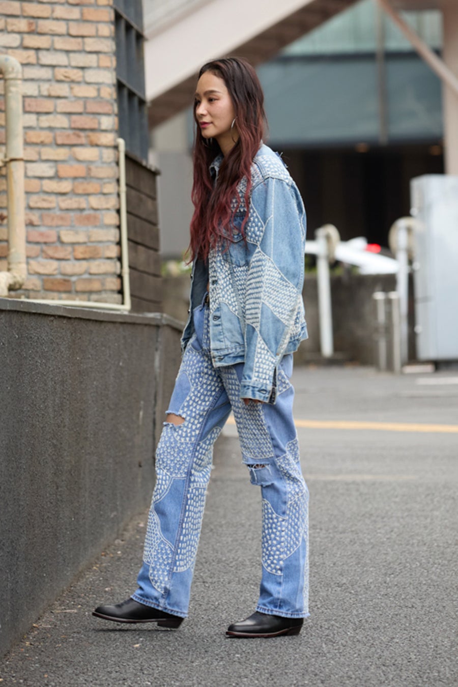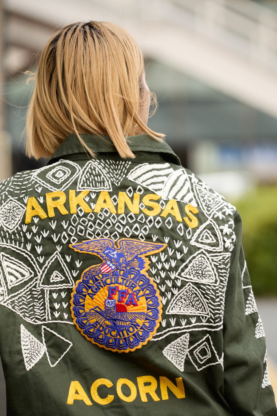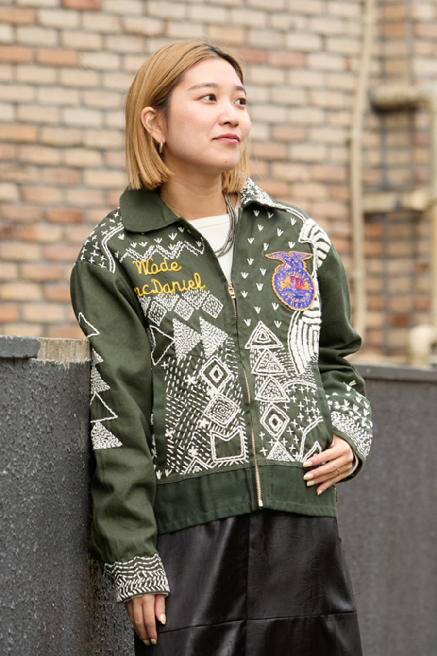 もともと施されていた刺繍やワッペンと、新たに加えたハンドステッチが交差する表情も見どころです。 ややコンパクトなサイズ感は今の気分にフィットし、ワイドパンツやワンピースとのスタイリングとも好相性。