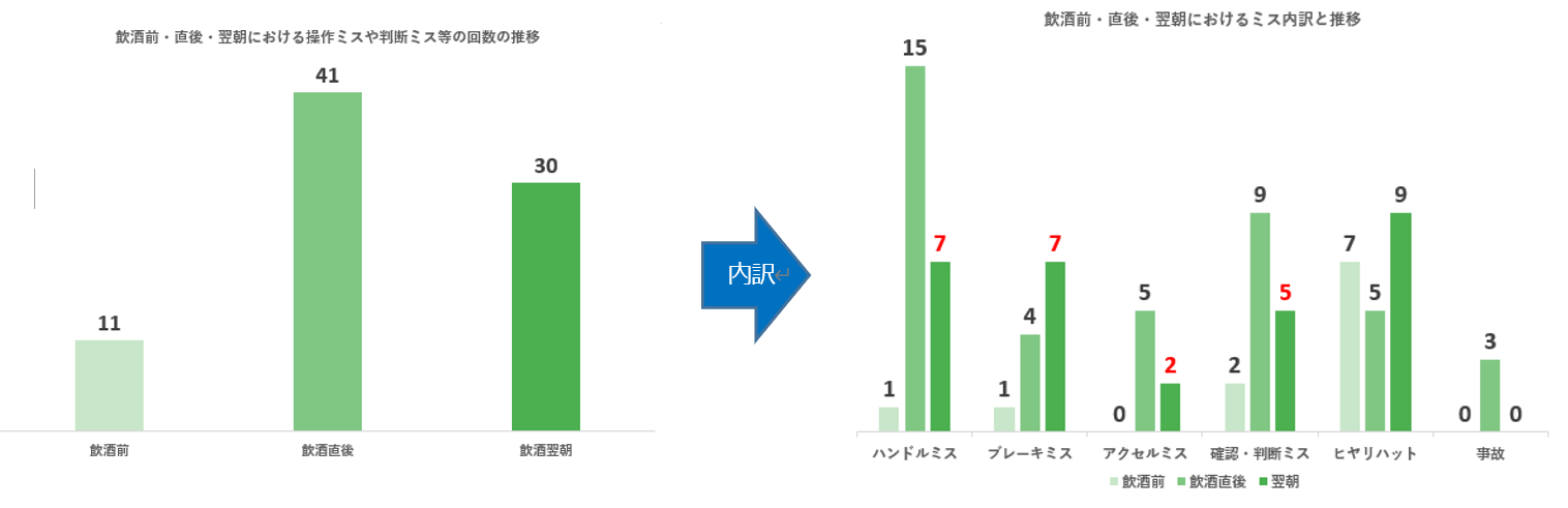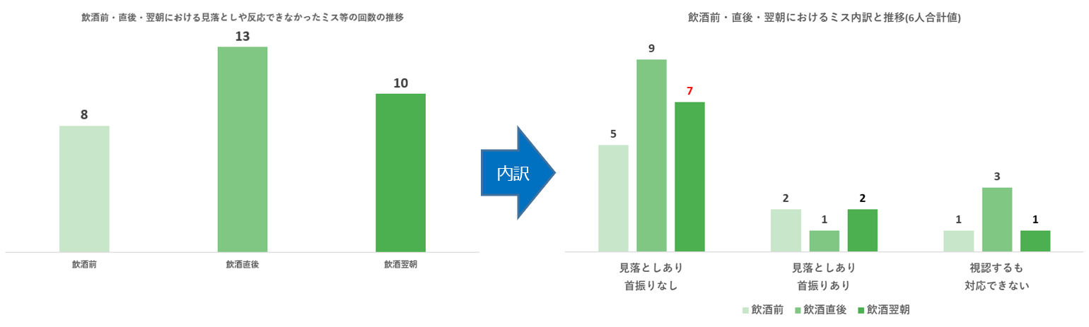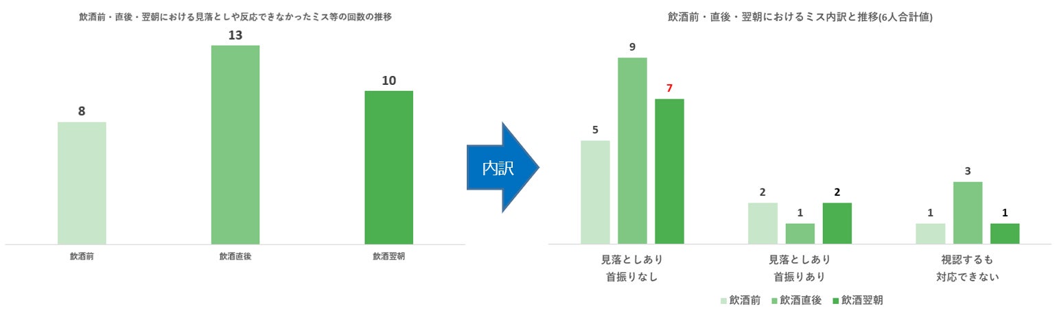 飲酒直後だけでなく、翌朝も飲酒前と比べ、操作ミスや確認・判断ミスが増加。「呼気濃度は出なかったが、体にだるさが残っている。運転もいつもよりパフォーマンスが落ちている感じがあった」という意見があった。