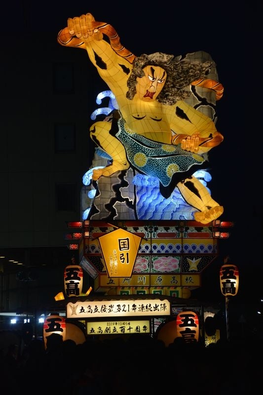 五所川原市で毎年8月上旬に開催される「立佞武多」は、明治中期から大正初期にかけて行われた伝統民俗で、「立佞武多」の名称は平成の復活の際に名付けられたものです。同じねぶたでも青森市のねぶたと大きく違う点は「高さ」にあります。立佞武多の背の高さは、最大で約22m強、重さ16トンにおよび、七階建てのビルの高さにも相当する巨大な山車が「ヤッテマレ、ヤッテマレ!」のかけ声とともに曳かれ、市中を練り歩きます。