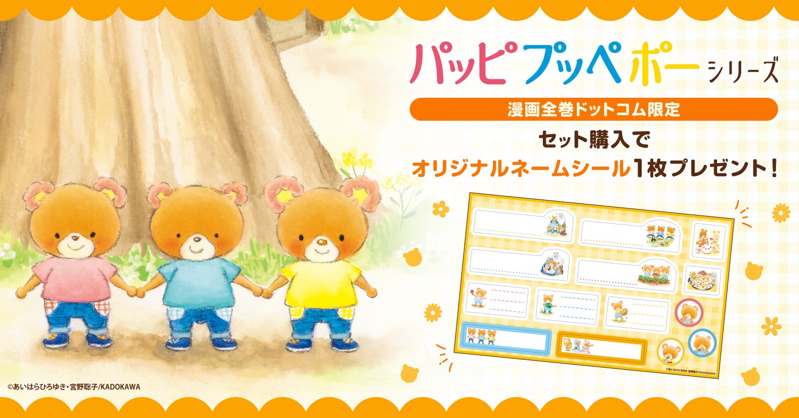 100人の保育士・幼稚園先生が推薦する、可愛いこぐまの3きょうだい、パッピ、プッペ、ポー絵本シリーズをご購入していただいた方に、ネームシールをプレゼント!!