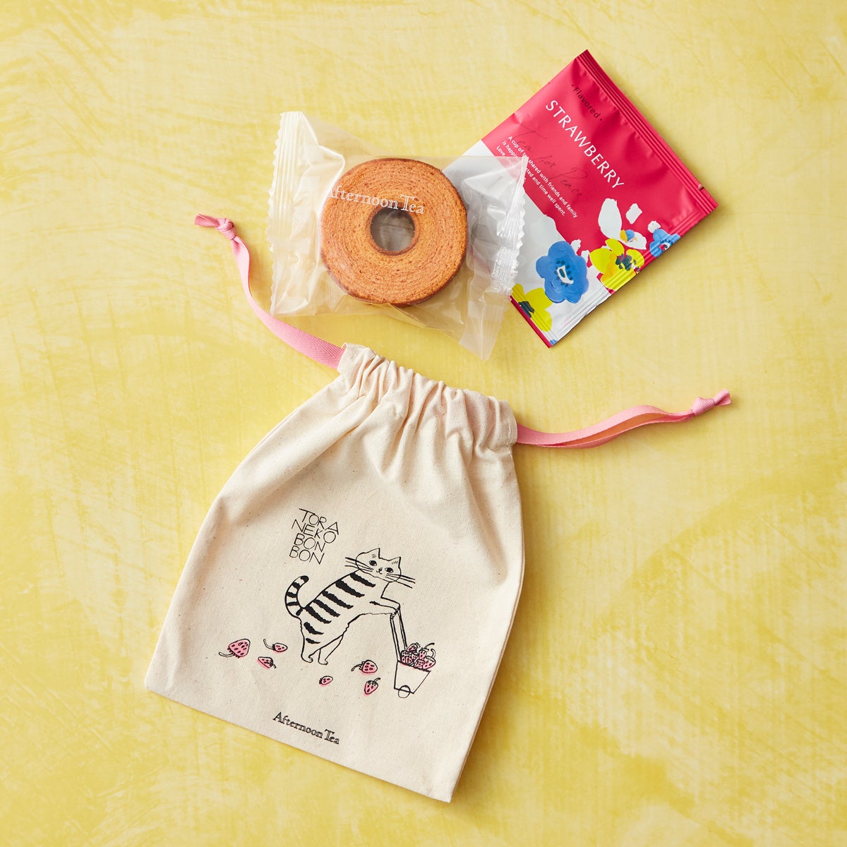 かわいい巾着ポーチにいちご味のバウムクーヘンとストロベリーティーが入った、春限定のティータイムセットです。