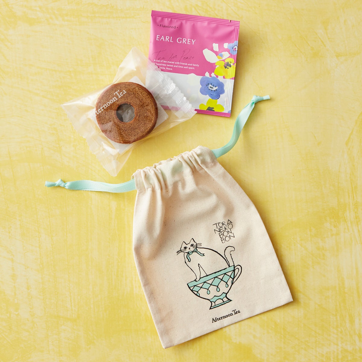 かわいい巾着ポーチにアールグレイ味のバウムクーヘンとアールグレイの紅茶が入った、春限定のティータイムセットです。