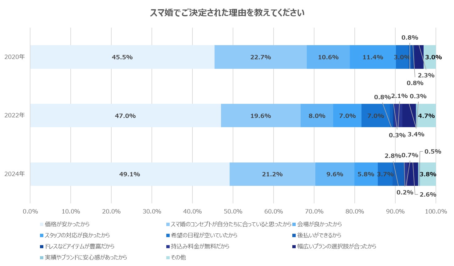 スマ婚を成約した方の理由を聞きました。2020年、2022年、2024年と比較したところ、すべての年で「価格が安かったから」という理由が上位に挙げられ、年々増加傾向にあることがわかりました。この傾向は、近年の経済状況や物価高が続く中で、結婚式にかかる費用を抑えたいと考えるカップルが増えていることを反映していると思われます。