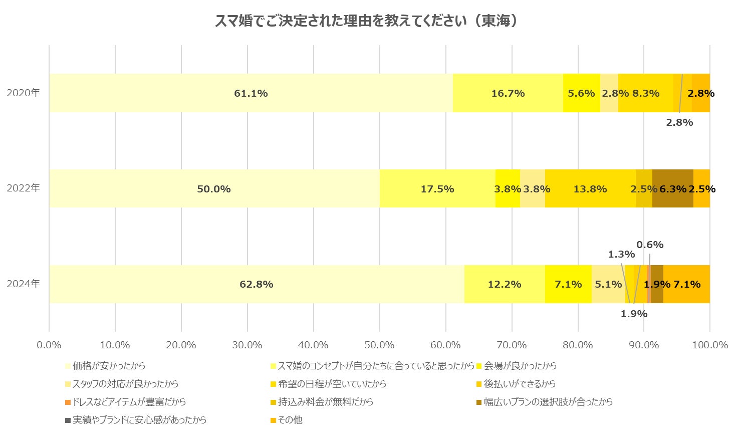 地域別に比較すると、東海エリアは2020年から2024年のすべての年で、「価格が安いこと」を理由に成約した割合が最も高いことがわかりました。名古屋を中心とした東海エリアでは、派手な結婚式のイメージが強いものの、結婚式のスタイルは多様化しており、近年はコストパフォーマンスを重視する傾向が強まっていると考えられます。実際、スマ婚における東海エリアの平均費用は、関東・関西と比較すると高めの傾向にあります。それでも「安い」と感じていただけるのは、東海エリアでは他サービスの価格が比較的高いことが影響している可能性があります。