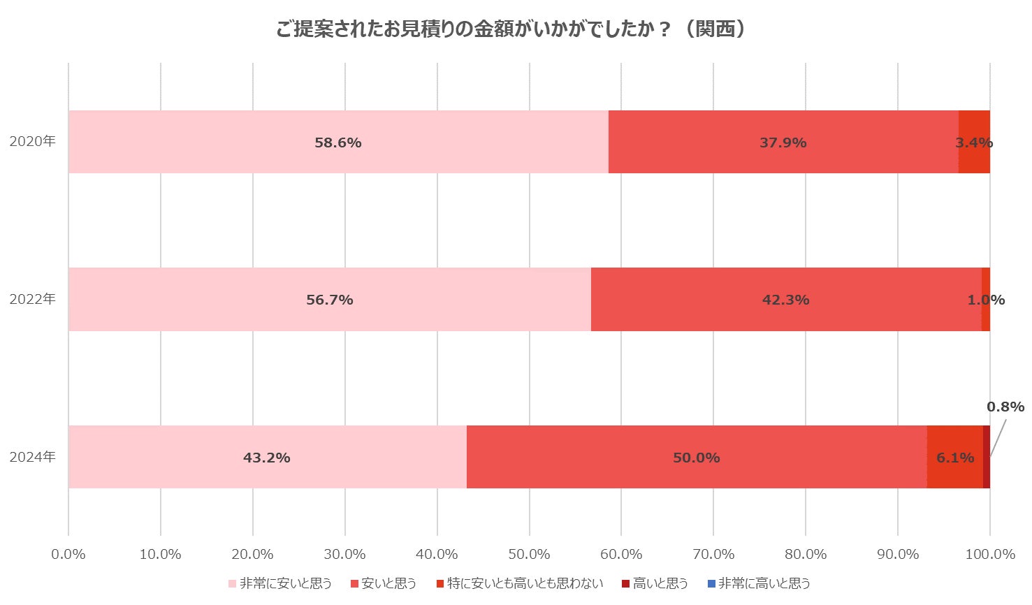 ただし、わずかではありますが、2022年には「高いと思う」、2024年には「非常に高いと思う」という回答も見られました。この背景には、長引く物価高や将来への経済的不安が影響し、結婚式にかかる費用に対する価値観の変化が生じていると推察されます。また、結婚式費用を抑えたプランやサービスを提案する事業者が増えており、他のプランとの相対的な価格比較が影響している可能性も考えられます。
