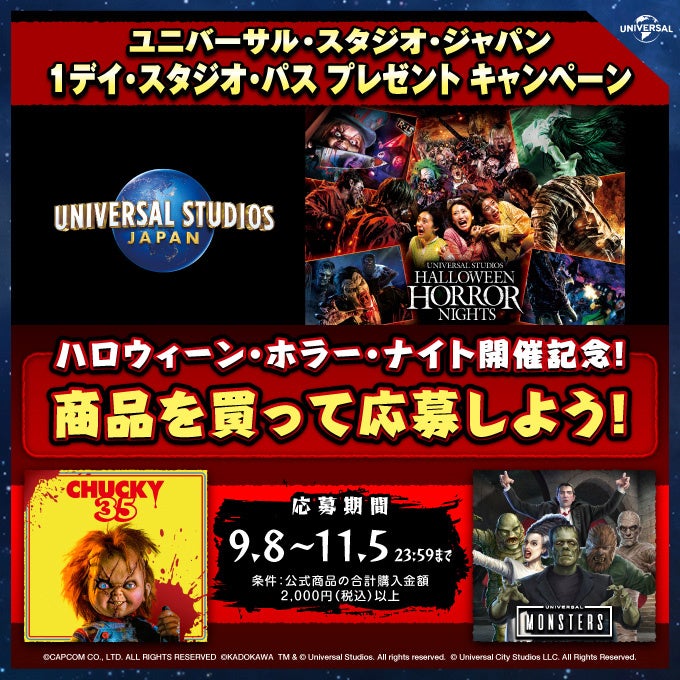 「ハロウィン・ホラー・ナイト開催記念!ユニバーサル・スタジオ・ジャパン1デイ・スタジオ・パスプレゼントキャンペーン」が全国で開催中。「ポケユニ」商品も対象です。詳細は下記URLをご覧ください。