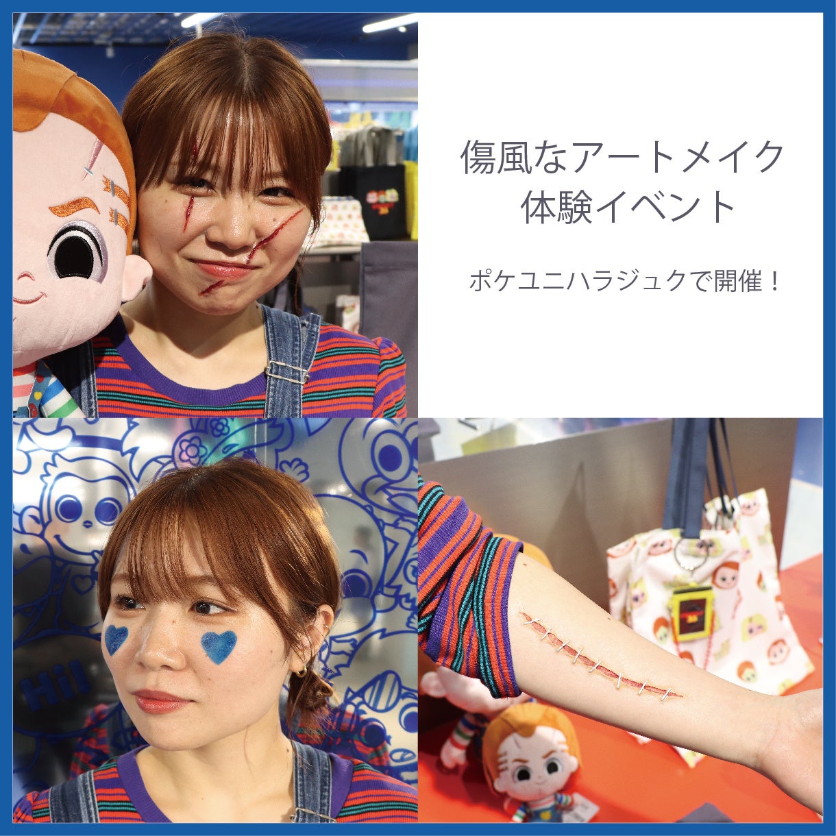ポケユニハラジュクにてハロウィーンが盛り上げるチャッキ―風の傷メイクが体験できるイベントを開催します。アートメイクタイプは3種類。お子様向けポケユニカラーのハートメイクも。