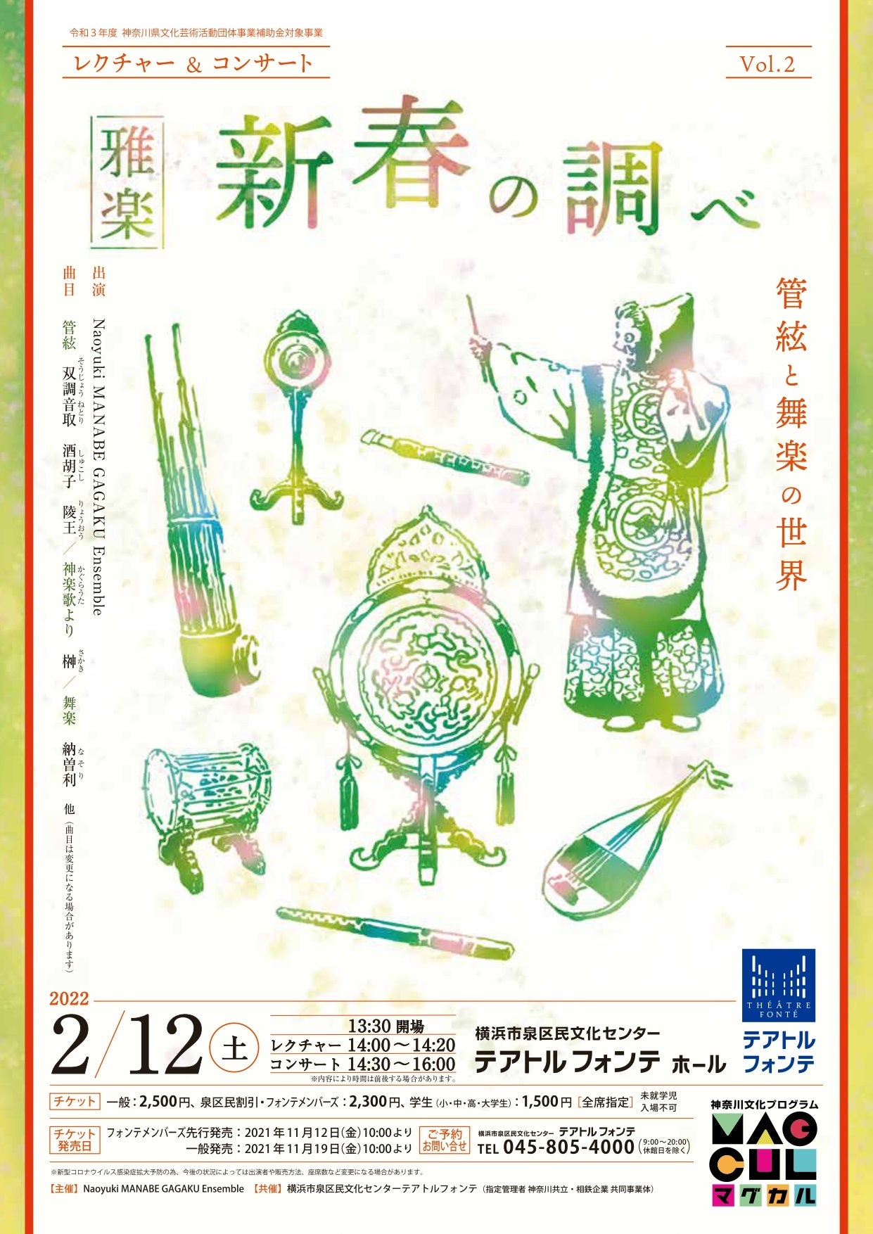 Naoyuki MANABE GAGAKU Ensemble主催による、Naoyuki MANABE GAGAKU Ensemble ~管絃と舞楽の世界~『レクチャー&コンサート 雅楽 新春の調べ』が2022年2月12日 (土)に横浜市泉区民文化センター テアトルフォンテ ホール(神奈川県横浜市)にて上演されます。チケットはカンフェティ(運営:ロングランプランニング株式会社、東京都新宿区、代表取締役:榑松 大剛)にて発売中です。