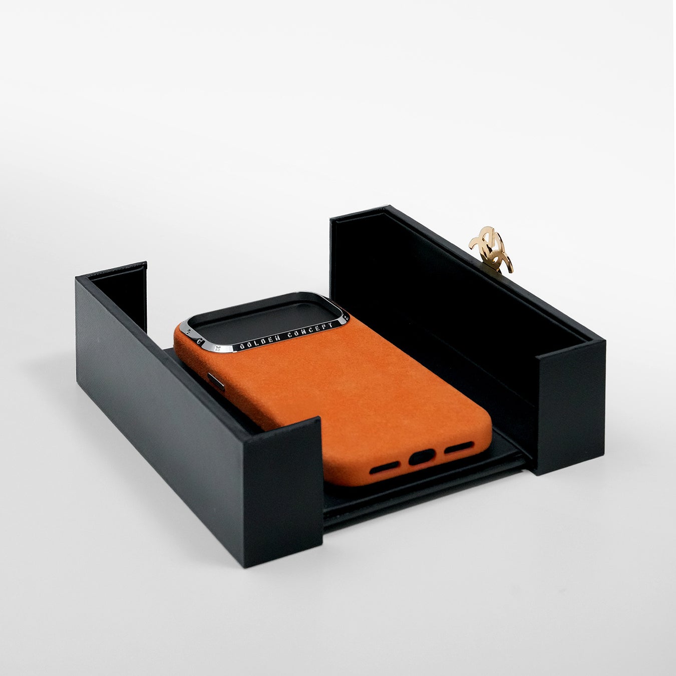 高精度に切削された高研磨仕上げのアルミニウム製カメラフレームには、ゴールデンコンセプトのモノグラムを刻印。その反射する美しい輝きが、Alcantara® のマットな質感と鮮やかなコントラストを生み出し、カメラ周りに明確な輪郭と構造美をもたらします。素材の対比によってケース全体の造形美が際立ち、建築的な存在感を一層強調しています。