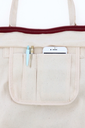 ファスナー付きで中身が見える心配がなく、内側のポケットと肩にかけやすい長めの持ち手もポイントとなっています。