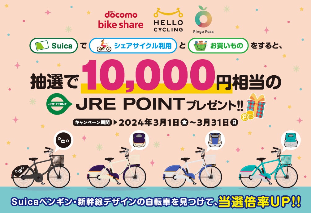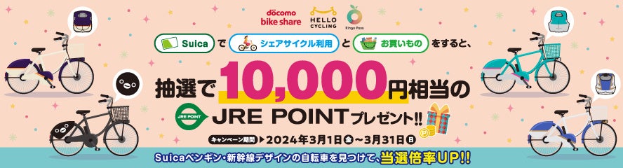 ○JR東日本では、Suicaをシェアサイクルとエキナカ・街ナカのお買いものにてご利用いただいたお客さまを対象に、抽選で100名様にJRE POINT 10,000ポイントをプレゼントするキャンペーンを実施します。 ○Suicaのペンギンや新幹線デザインのシェアサイクルをご利用いただくか、キャンペーン期間中に10回以上シェアサイクルをご利用いただくと、当選確率がアップします。 ○普段のお出かけやご旅行等で便利でおトクにSuicaをご活用ください。 |
