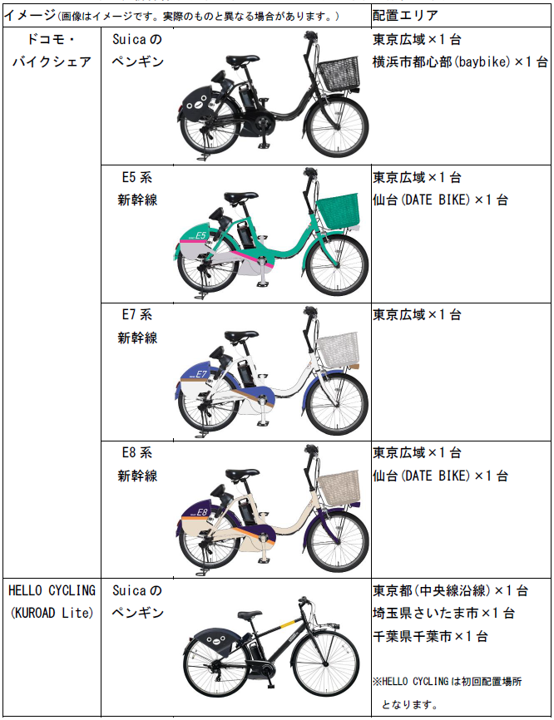 <Suicaのペンギン、新幹線デザインイメージのシェアサイクル配置エリア>