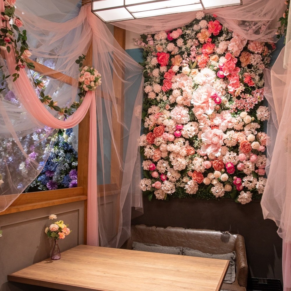 淡く優しいピンクの花が広がる、ロマンチックで可憐な空間。記念日デートや大切な人との食事に最適。