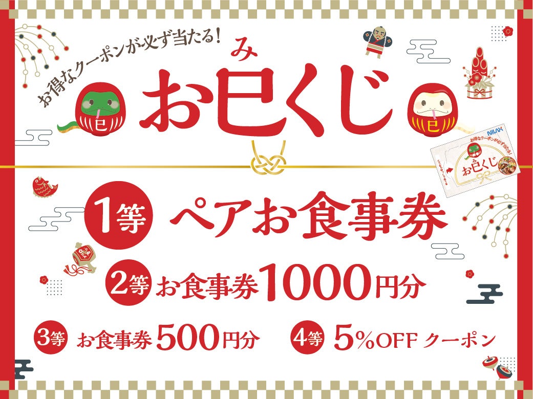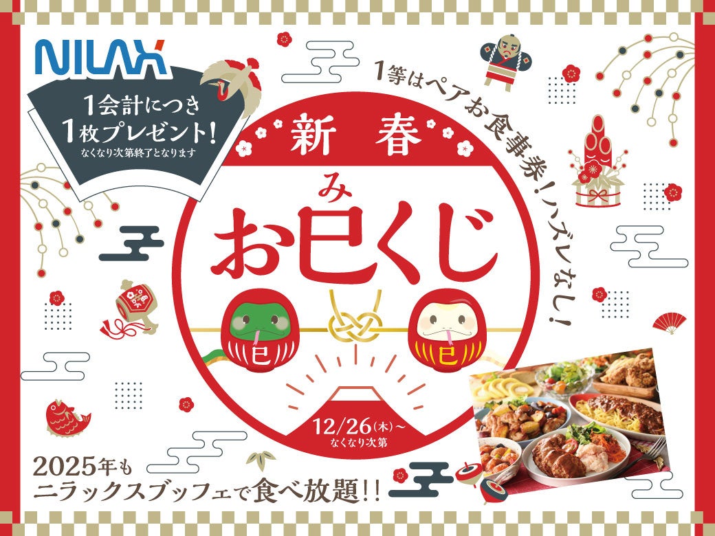この度、2024年12月26日(木)より、『新春おみくじ』を実施致します。はずれなしの運試し!! 1等はニラックスブッフェでご利用いただける『ペアお食事券』!!