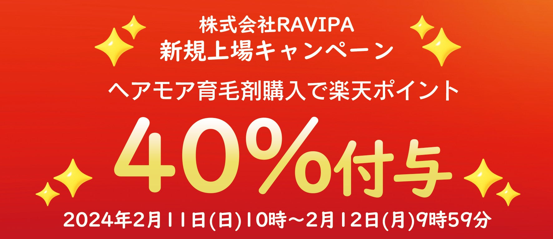 【株式会社RAVIPA上場記念キャンペーン】2月11日(日)10:00~2月12日(月)9:59限定!ヘアモア楽天ぺージにてポイント40%付与キャンペーンを実施
