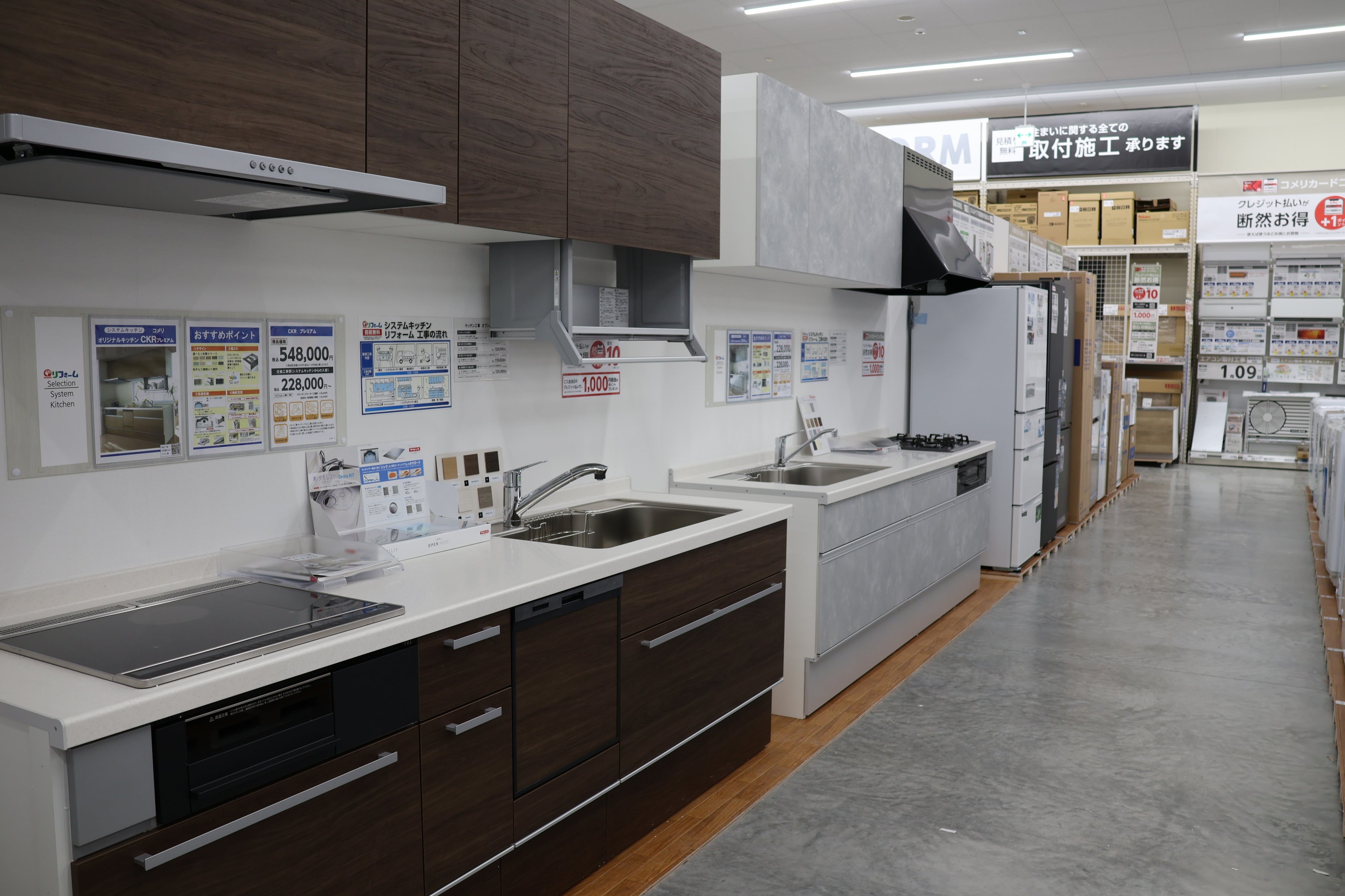 コメリでは、お客様の住まいのお困りごとを総合的に解決するため、全国1,200以上のコメリ店舗でリフォーム受付を行っております。能勢店ではビルトインコンロや洗面化粧台、トイレ等の住宅設備機器売場をご用意しています。システムキッチンやシステムバスへの交換等、本格的なリフォーム工事にも対応いたします。また、家電・インテリア・家庭用品など、お客様の暮らしに必要な商品の品揃えも充実させました。