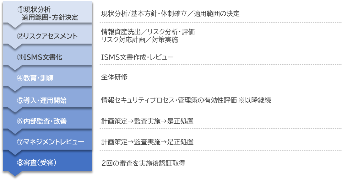 NTT Risk Managerが提供する「ISMS認証取得支援」は、お客さまのISMS認証取得/既存認証の更新をご支援します。下記の代表的な「ISMS認証取得支援」の各手順において、現状分析に基づく取り組むべき課題や管理策のご提言、文書作成、研修の実施、内部監査項目の策定等のご支援を行います。これにより、お客さまの事業継続性の向上や対外的信用の獲得に貢献します。