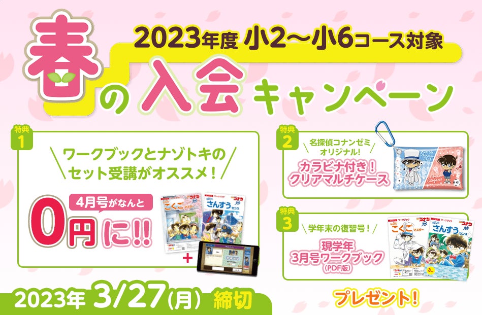 株式会社小学館集英社プロダクションが運営する「小学館の通信教育 名探偵コナンゼミ」では、2023年1月11日(水)から、4月に新学年を迎えるお子さま向けに「春の入会キャンペーン」を実施します(※1)。