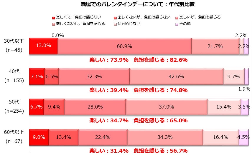 年代別に比較すると30代以下では「楽しい」と回答する人の比率が7割を超えました。「楽しい」と回答する比率は年代が上がるごとに低くなる傾向が見られます。一方「負担を感じる」と回答した人の比率は30代以下で8割を超え、こちらも年代が上がるごとに低くなる傾向が見られます。フリーコメントにも様々な声が寄せられました。職場でのバレンタインには賛否両方の声があることや負担感などに配慮しつつ、上手に楽しむ工夫が必要なのだと思います。