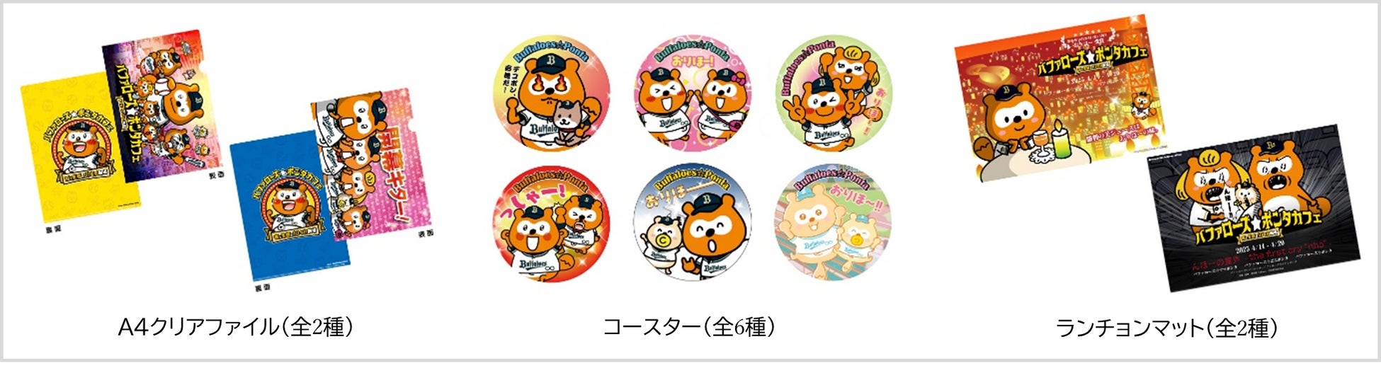 バファローズ☆ポンタが球団の応援を始めて、今シーズンで10年目となります。今回のカフェのテーマを「涙と笑顔の10年目劇場」として、試合に負けてしまった時や、3年連続でのリーグ優勝を果たした時など、10年間のさまざまな思い出を振り返るイラストで店内を装飾します。バファローズ☆ポンタで一色となった空間で、オリジナルのコラボメニューをお楽しみいただける他、カフェオリジナルのグッズを販売します。