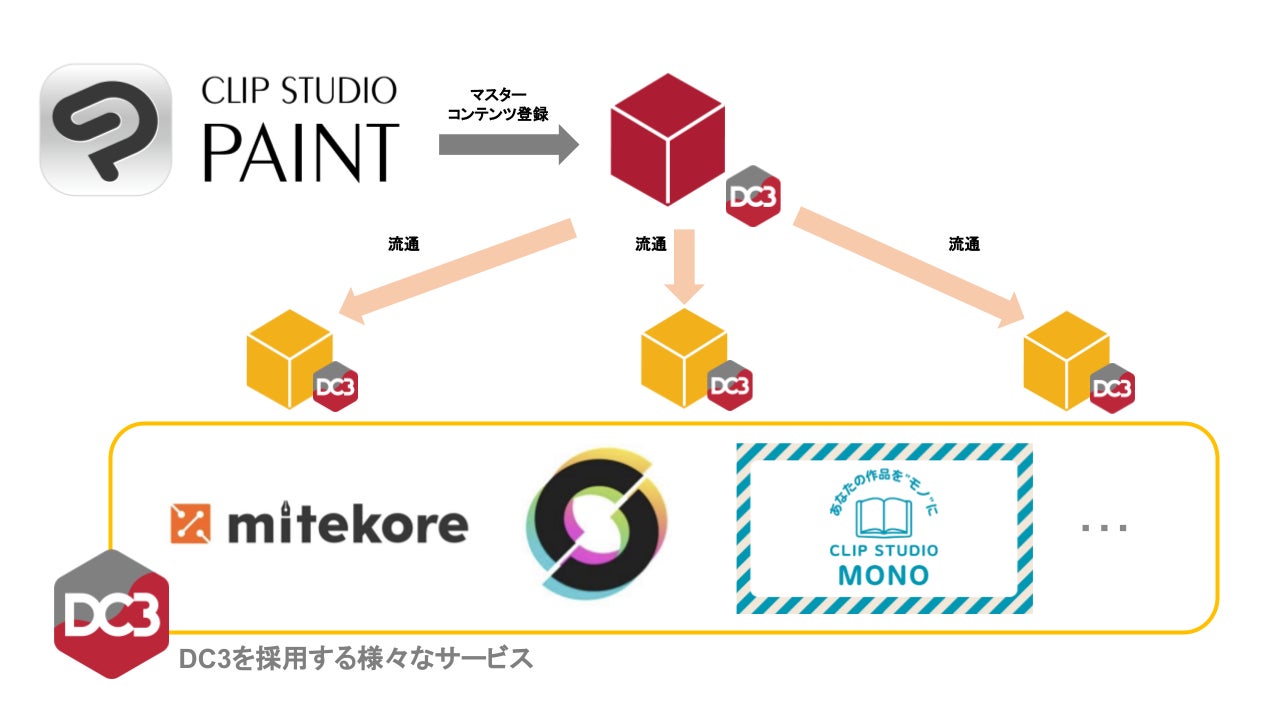 さらに、DC3の機能であるコンテンツのサービス間移動を利用することで、「CLIP STUDIO MONO」・兼松グランクス様の「mitekore」・とらのあな様の「Creatia」など、DC3を採用した様々なマーケットプレイスで自身の作品を販売することができます。