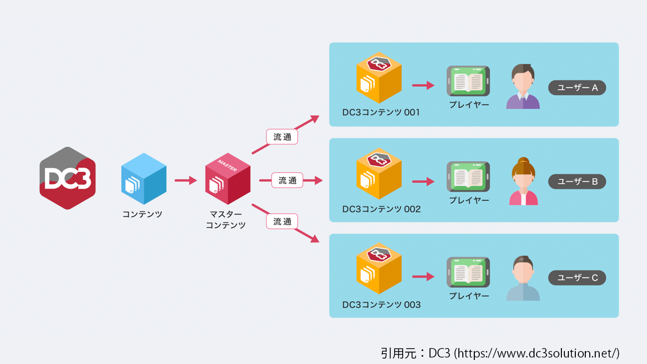 DC3は、あらゆるデジタルコンテンツを唯一無二の「モノ」として扱うことができるようにする、コンテンツ流通基盤ソリューションです。