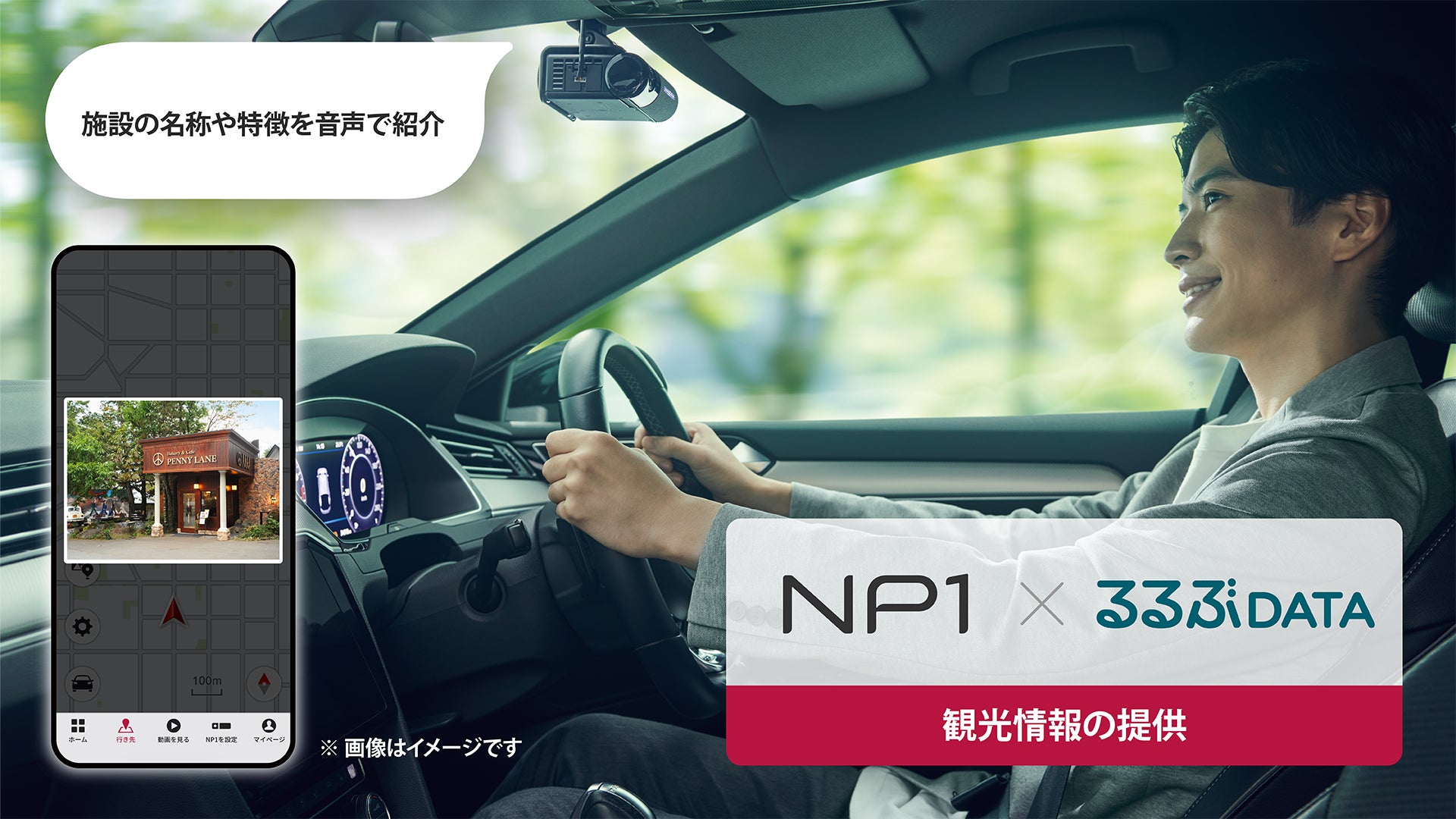 AI搭載通信型オールインワン車載器「NP1」とJTBパブリッシングの「るるぶDATA」を連携させることで、観光地における推奨のスポットやお店、周辺情報を「NP1」の音声やスマートフォンの「My NP1」アプリの画面を通じて、ドライバーに合わせてお知らせします。画像も含めたPOI情報※の自動取得や、配信情報を使った目的地設定のほか、履歴を振り返って次のお出かけプランを作成できるなど旅行に便利なサービスです。「My NP1」アプリでは、「るるぶ」アイコンと連携した情報検索や履歴を確認でき、「NP1」がさらに便利になります。