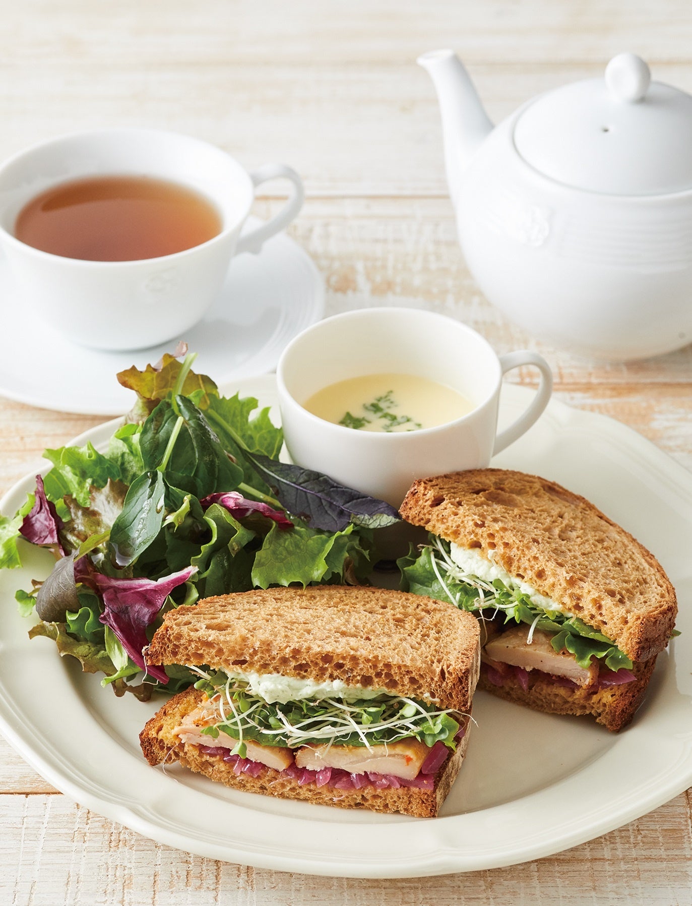 全粒粉のパンに、スイートチリとスパイスでマリネしたチキン、豆乳ハーブマヨ、レッドオニオンのマリネをサンドしました。コーンスープとともに。